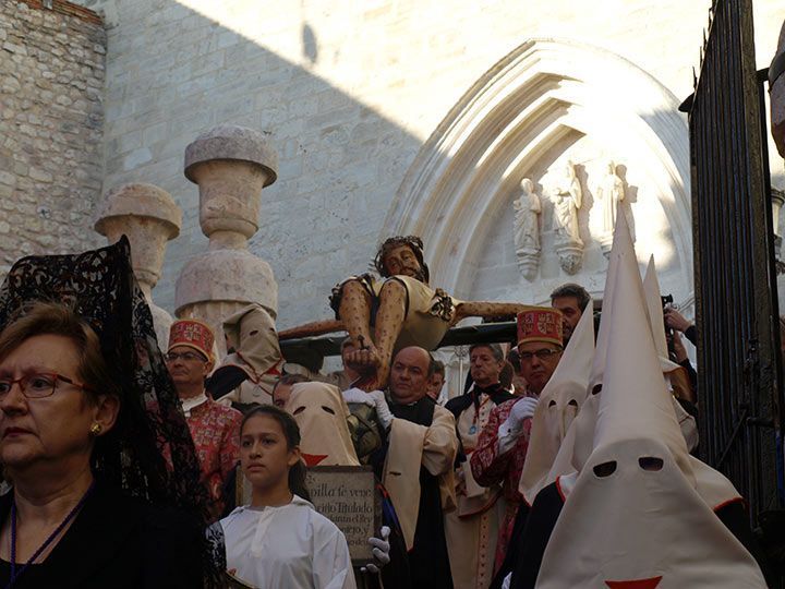 A continuación, el Cristo de las Santas Gotas se ha dirigido a la Capilla del Santísimo Cristo de Burgos para encontrarse con la imagen gótica del siglo XIV, la imponente figura articulada, caracterizada con un gran realismo, y que ha salido en contadas ocasiones de la Capilla. Precisamente, para acercar su devoción a los fieles, el Arzobispado de Burgos encargó en 2014 una réplica, que protagoniza el Acto del Descendimiento el Viernes Santo, sale en la Procesión del Entierro y en la de la Exaltación de la Santa Cruz, el 14 de septiembre.