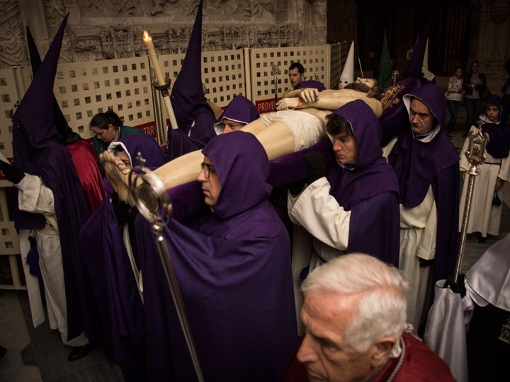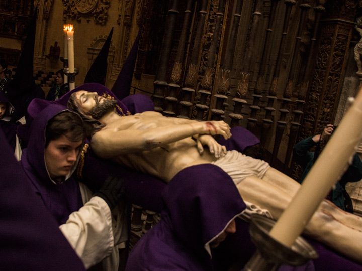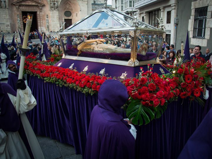 A hombros de los cofrades de la Hermandad del Santo Sepulcro, el Cristo Yacente ha abandonado la Capilla de los Condestables al son de los tambores y las cornetas de la banda de Nuestra Señora de la Soledad. Escoltado por los estandartes y priores de las cofradías y hermandades de Burgos, la talla de Francisco Font, de principios del siglo XX, ha recorrido la nave lateral y trascoro de la Seo burgalesa. La imagen muestra las huellas de su sufrimiento, las heridas de los clavos y algunas más en la frente, a consecuencia de la corona de espinas.