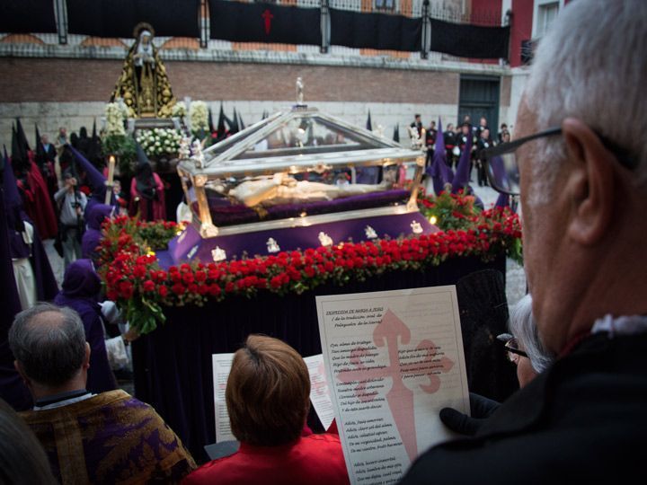 Los timbales le han dado la bienvenida a su salida de la Catedral y, tras la lectura de las Sagradas Escrituras, se ha introducido la talla en la santa urna del Santo Sepulcro, en presencia del arzobispo de Burgos, Fidel Herráez, y de autoridades civiles de la ciudad. A continuación, el paso ha iniciado recorrido para sumarse a la Procesión del Santo Entierro, previa parada a las puertas de la Iglesia de Santa Águeda, donde le esperaba Nuestra Señora de La Soledad, a la que le han dedicado una pieza musical cantada y unas breves palabras.