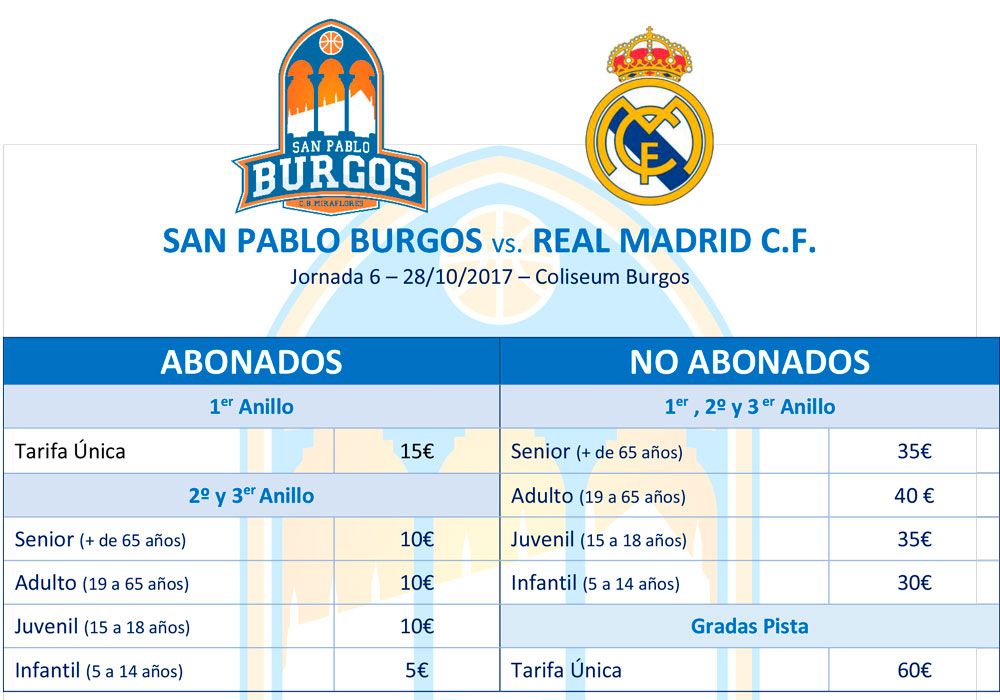 El San Pablo Burgos ha dado a conocer esta mañana los precios de las entradas para asistir al encuentro de Liga Endesa que les enfrentará al Real Madrid el próximo sábado 28 de octubre a las 19:00 horas en el Coliseum Burgos. El encuentro ha sido declarado por la directiva Día de Ayuda al Club, lo que implica que, tanto los que son abonados, como los que no lo son, deberán de adquirir una entrada.