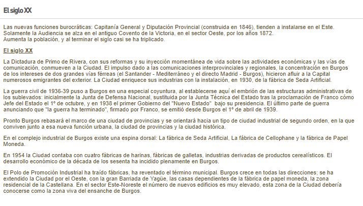 Así, en el texto anterior se recogía que «La guerra civil de 1936-39 puso a Burgos en una especial coyuntura tal vez única entre las ciudades de España, Burgos albergó desde el primer momento al Gobierno Nacional, desde la primitiva Junta de Defensa, hasta la elevación del generalísimo Franco como Jefe del Estado y las negociaciones de paz de los enviados de Besterio (sic), en Febrero de 1939«.
