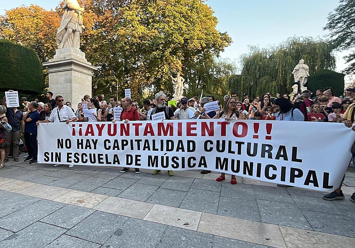 Bajo el lema 'No hay capitalidad cultural sin escuela de música municipal', profesores, alumnos y padres y madres -en muchos casos con sus instrumentos- se han concentrado exigiendo respuestas a una crisis que pone en riesgo el inicio del curso.