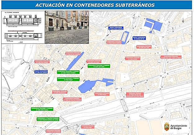 El Ayuntamiento de Burgos invertirá 1,3 millones de euros en un proyecto de remodelación de los contendores subterráneos del centro histórico, con el objetivo de que se adapten a la nueva normativa y, sobre todo, se unifiquen para crear las denominadas 'islas completas', mejorando el servicio que se presta a los ciudadanos y facilitando la recogida de basuras.