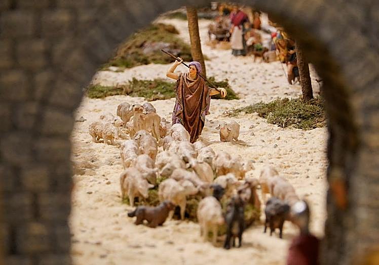 En una de las escenas se despliega el campo, donde se encuentra el Portal, la Anunciación, la adoración de los pastores, la paz de lo cotidinao. Entre los caminos se divisa un peregrino muy especial, el Papa Francisco, una figura que el maestro belenista trajo directamente de Roma y que camina rodeado de su rebaño para visitar al niño.