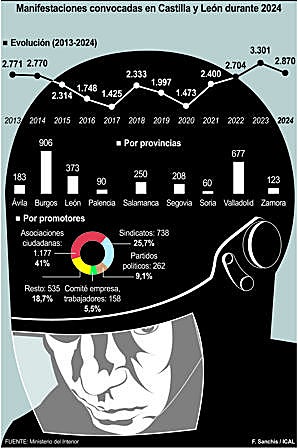 Después de un 2023 récord en manifestaciones en Castilla y León, con 3.301, la cifra más alta de la historia de la comunidad, el pasado año se registró una caída del 13,05 por ciento, al contabilizarse 2.870 protestas. Este descenso ha sido mucho más acusado en la comunidad, dado que a nivel nacional solo fue del 2,40 por ciento, al pasar de 31.715 a 30.955.