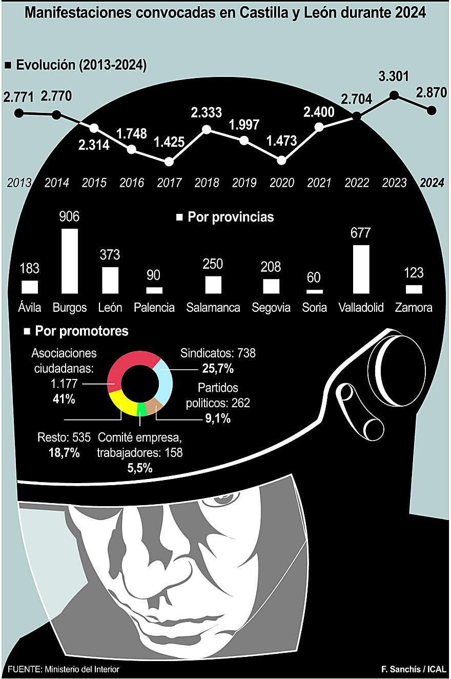 Tras el récord alcanzado en 2012, donde la conflictividad laboral, los recortes económicos y el movimiento 15-M dispararon el número de manifestaciones convocadas en Castilla y León hasta las 3.124, esta cifra se fue reduciendo progresivamente hasta las 1.425 de 2017. La tendencia se rompió en 2018 cuando se alcanzaron las 2.333 concentraciones, aunque en 2019 se produjo otro descenso, hasta las 1997. Desde entonces la cifra ha ido creciendo hasta el récord del pasado año. Así, mientras en 2017 se celebraron en la Comunidad una media de 3,90 manifestaciones al día, el pasado año esta cifra se situó en 7,86.