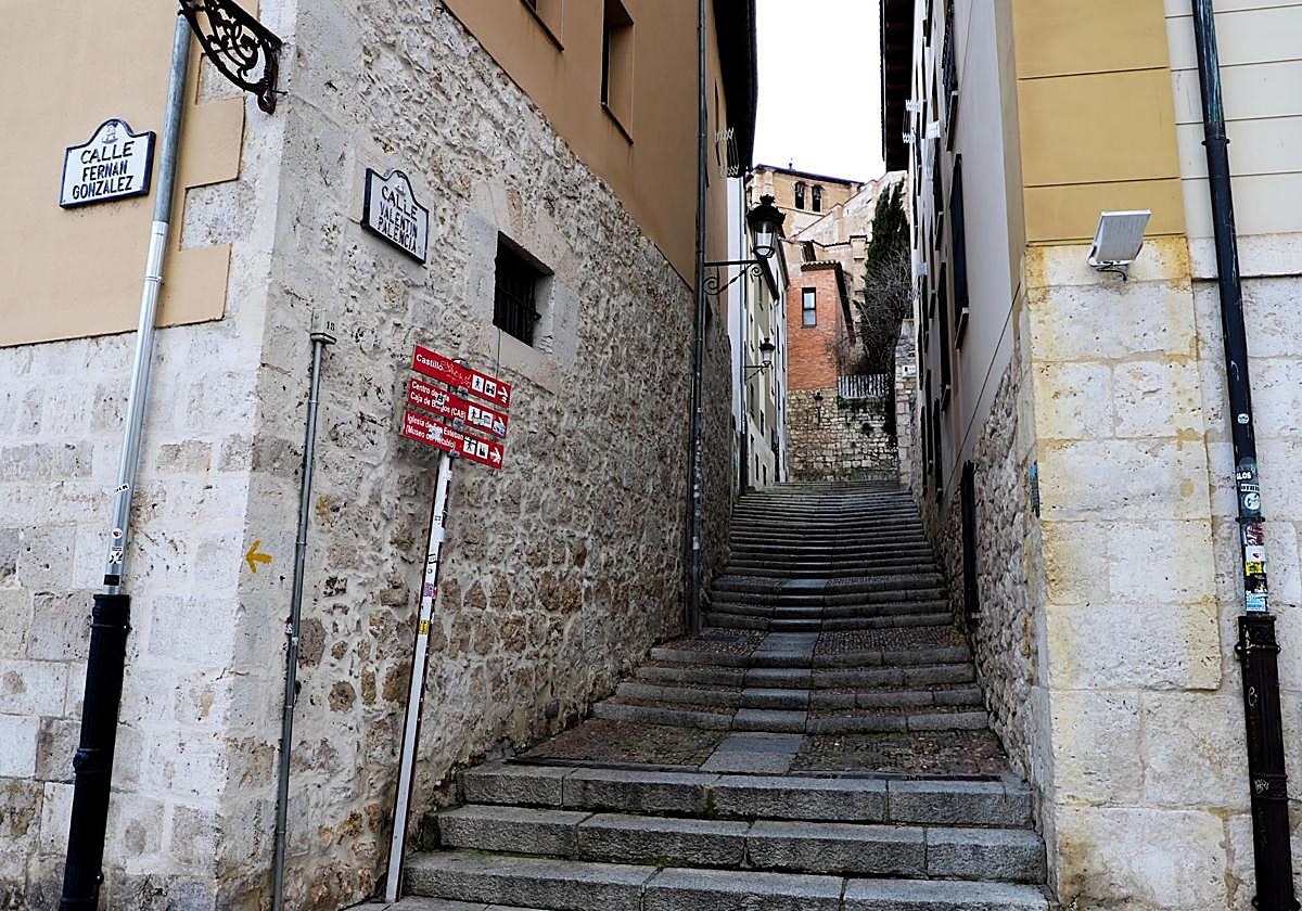 A la calle Valentín Palencia se accede desde Fernán González; a mitad de camino desde la calle Saldaña y termina en San Esteban.