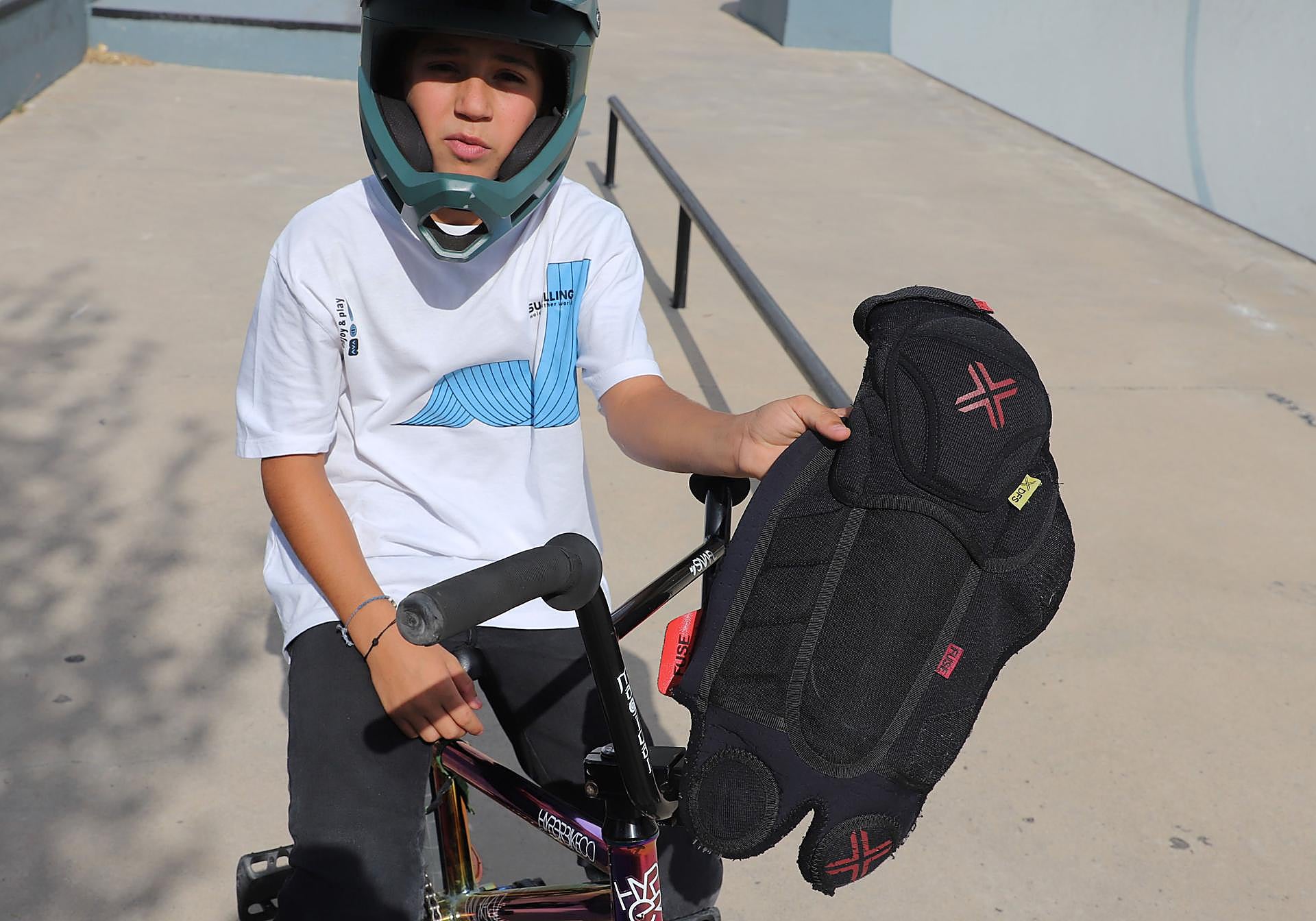 Al practicar y competir, Izan no duda en ponerse el casco porque, una vez, se cayó y se rompió un diente. Además, no es la única protección que utiliza el deportista de Burgos: también viste una defensa que le protege desde la rodilla hasta el tobillo.