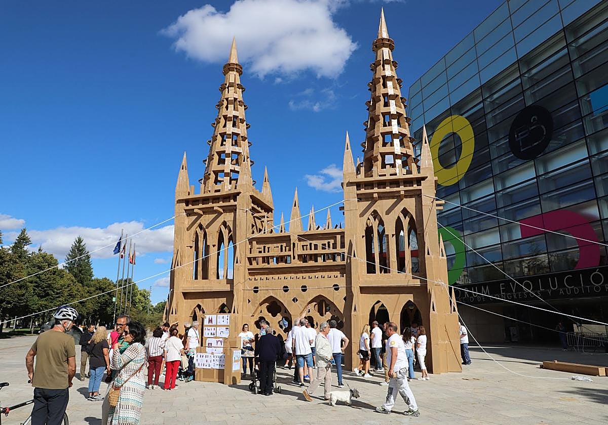 Los voluntarios que trabajan en este proyecto han realizado una réplica de la Catedral de Burgos. Para ello han utilizado un material similar a las cajas de cartón, que cede la empresa burgalesa Smurfit Westrock. Son un total de 3.000 cajas con un peso de un kilogramo por cada caja; es decir, una Catedral de tres toneladas que va a quedar expuesta frente al Fórum Evolución este viernes y que morirá derruida el próximo domingo.