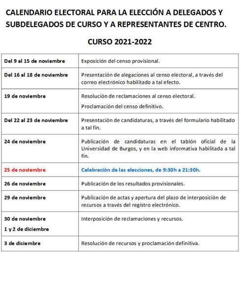 En función del calendario electoral que regirá el proceso, el día 3 de diciembre se procederá a la proclamación definitiva de los representantes de los distintos grados y centros y a la constitución del nuevo Consejo de Alumnos (CAUBU), quedando el actual en funciones desde la fecha de hoy.
