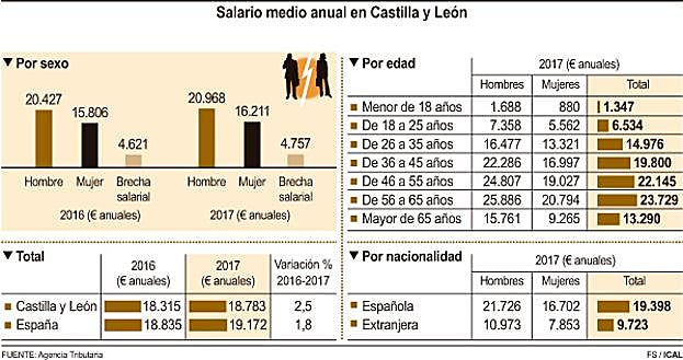 En términos globales, los salarios medios de hombres y mujeres crecieron el año pasado en todas las provincias, en Burgos (20.306 euros), un 2,9%; en León (18.333) y Soria (18.918), un 2,7% en las dos; en Salamanca (18.173), un 2,6%; en Segovia (17.523) y Zamora (16.225), un 2,5%, en ambos casos; en Ávila (16.348) y Valladolid (20.224), un 2,4% en cada una; y en Palencia (18.469), un 1,6%.