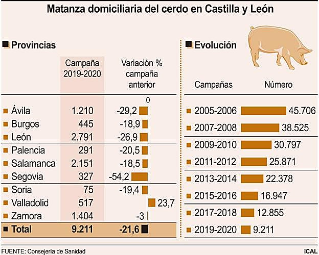 La tradición se pierde en todas las provincias, pero continúa gracias a la actividad de León y Salamanca, que el año pasado sumaron más de la mitad de las matanzas en la comunidad, con 2.791 y 2.151, en cada caso. Eso sí, por debajo de las 3.816 y las 2.640 de la campaña precedente.