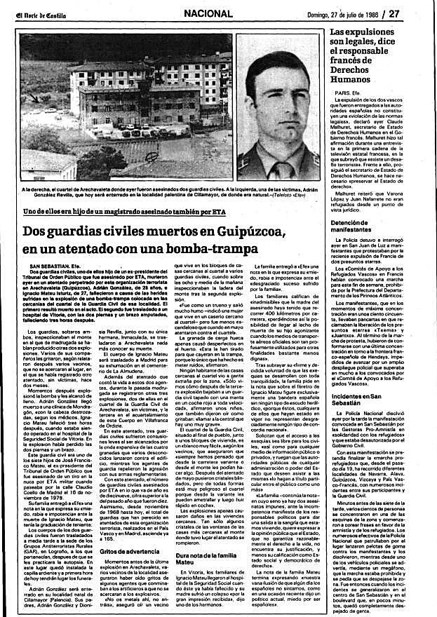 La explosión del artefacto escondido junto a la casa cuartel de Aretxabaleta provocó la muerte del teniente Ignacio Mateu Istúriz (un madrileño con raíces burgalesas y cuyo padre también fue asesinado por ETA en 1978) y del cabo primero Adrián González Revilla, 28 años, natural de Cillamayor (en Palencia). Adrián llevaba cinco años en la Guardia Civil, cuatro de ellos en los GAR. El etarra Luis Enrique Gárate 'Zorro', quien presuntamente participó en el atentado, fue detenido en el sur de Francia en 2004 y condenado a 15 años allí.