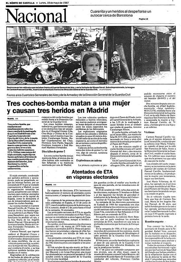 Había sido un día de fiesta. De fiesta grande en la familia, que celebraba las bodas de plata de José María, uno de sus integrantes. La celebración se había alargado hasta bien entrada la madrugada y a las 5:25 horas, Carmen volvía a casa con varios familiares en un vehículo. La mala suerte quiso que parara en un semáforo en rojo situado muy cerquita de la Dirección General de la Guardia Civil de Madrid y a apenas unos metros de la casa de su hija María Ángeles, con la que vivía y que también iba en el coche. Explotó un coche bomba (robado en San Sebastián) con más de diez kilos de explosivos, aparcado en la calle General Ibáñez de Ibero. Carmen, viuda, de 79 años, murió.