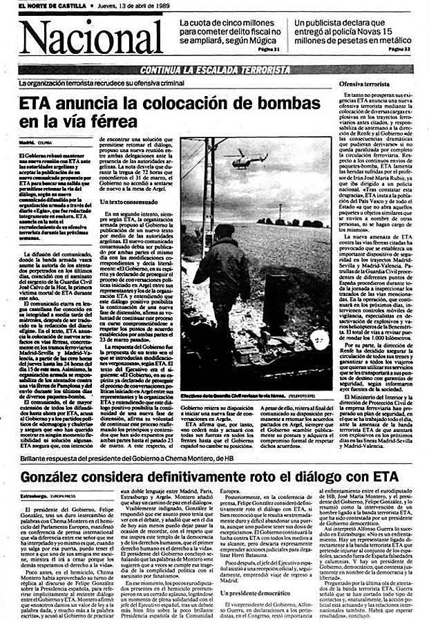 José Ignacio Pérez Álvarez: ataque con una bicicleta bomba. Policía nacional. 39 años. Había nacido en Villagatón (León). Llevaba ocho años en Galdácano. Casado y con tres hijos.