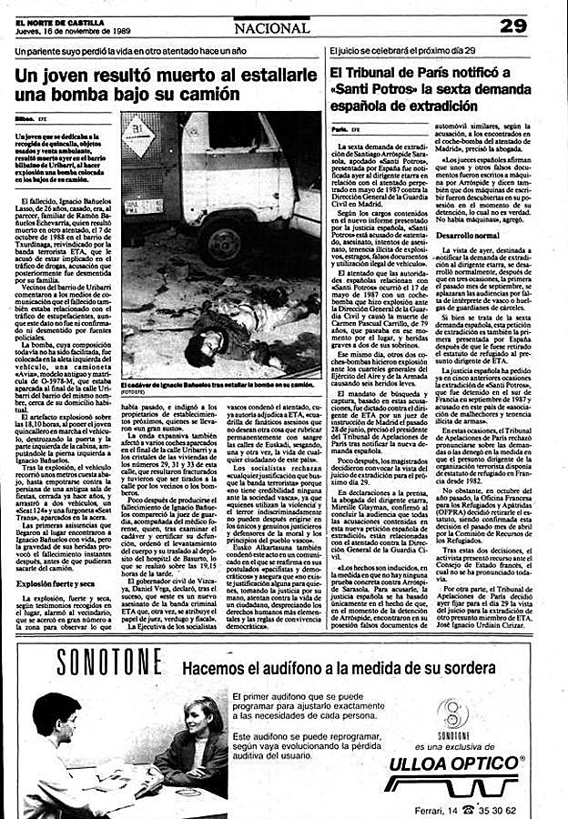 Ignacio Bañuelos Lasso: una familia en el punto de mira del terrorismo. Vendedor ambulante en Bilbao. Había nacido en Guardo (Palencia). Estaba casado y tenía dos hijos. 26 años.