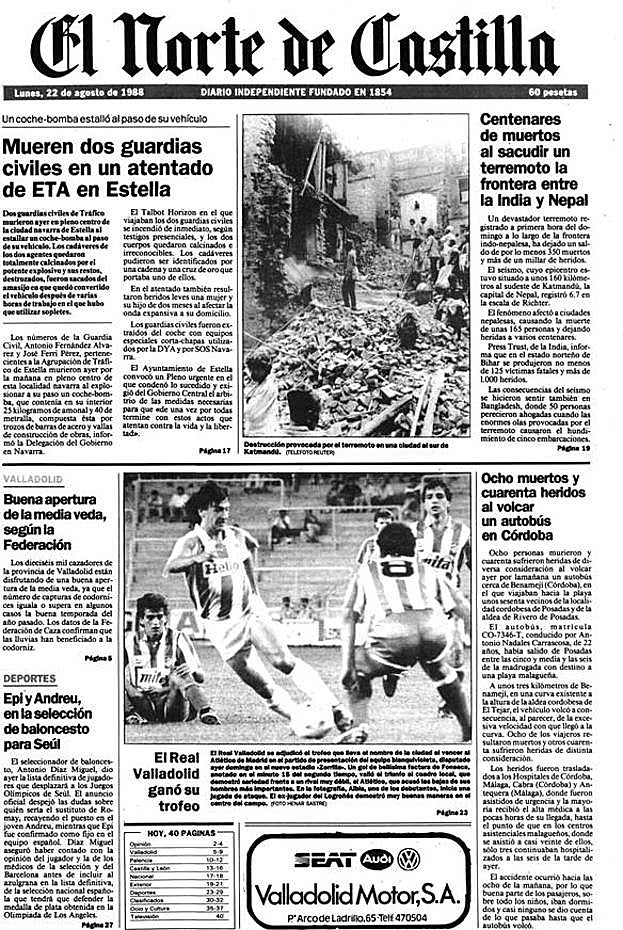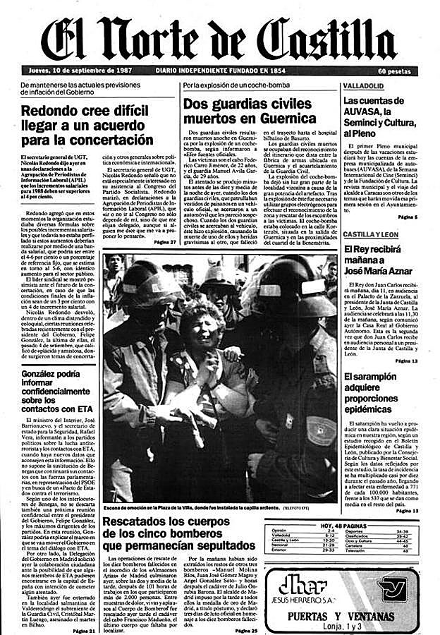 El teléfono público del único bar de Cillamayor (Palencia) sonó con timbrazos de luto el 26 de julio de 1986. Marino Olea, el propietario del negocio, descolgó. Una voz al otro lado le informó de la muerte de Adrián González Revilla, 27 años, hijo del pueblo, guardia civil, asesinado por ETA cuando una bomba trampa le alcanzó en las inmediaciones del cuartel de Aretxabaleta, en Guipúzcoa. Nadie sabía cómo contactar con la familia –sus padres y hermana vivían en Madrid–, así que alguien decidió llamar al bar del pueblo y a ver si así. Marino corrió de casa en casa para comunicar la noticia. Apenas le salía la voz. Después, desde el pueblo avisaron a la familia.