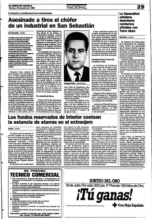 Gregorio Caño García: murió el chófer del objetivo de ETA. Conductor en Sapa, empresa dedicada al abastecimiento de armas al Ejército. Natural de Villamañán (León).