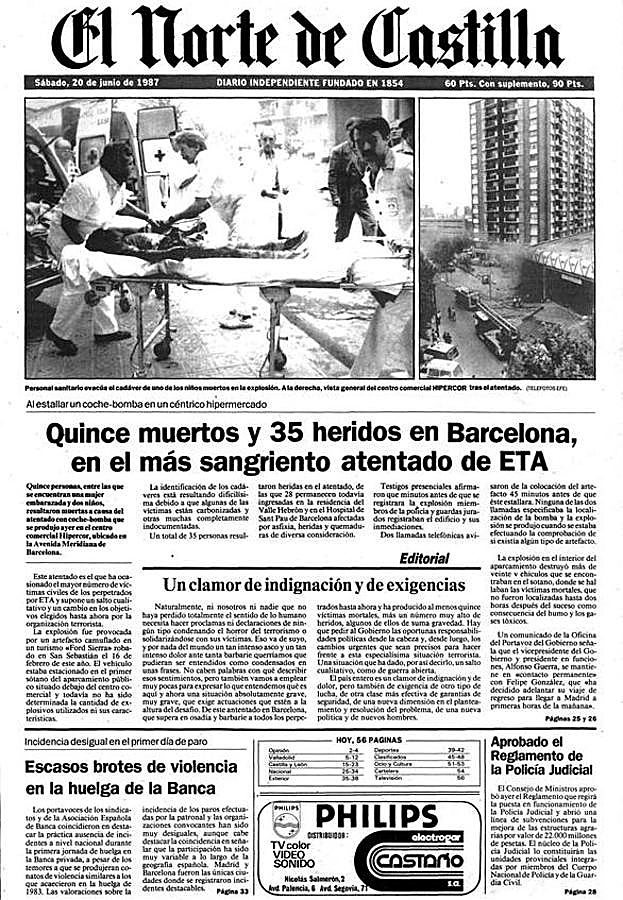 ETA tenía mil tentáculos en aquellos años. Había un comando en el País Vasco que se dedicaba casi en exclusiva a robar vehículos, que luego eran entregados a las células encargadas de cometer los asesinatos. El 16 de junio robaron en San Sebastián el coche que luego harían explotar, a las 16:08 horas, en el segundo sótano del aparcamiento de Hipercor de la avenida Meridiana. Metieron varios bidones con explosivos para que el alcance de la bomba fuera todavía mayor. Los terroristas hicieron tres llamadas (al centro comercial, la Guardia Urbana y el diario 'Avui') para avisar de la colocación del artefacto, pero al no hallarlo, se pensé que se podía tratar de una falsa alarma.