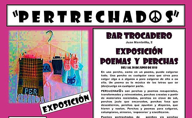 De nuevo, la artista y poeta Mercedes Pastor Segovia vuelve a sorprendernos con otra de sus originales exposiciones. En una percha, como en un poema, puede colgarse todo. Una percha es cualquier cosa que sirva para colgar algo o a alguien o para colgarse de ella o en ella. Un poema es la música de las letras que se (des)cuelga en cualquier parte. Poemas pertrechados de perchas y/o perchas pertrechadas con poemas. No es necesario que vayáis pertrechad@s de nada, ni siquiera que llevéis percha, pero no dejéis de colgaros de esta curiosa e insólita exposición. Bar Trocadero (Juan Mambrilla, 2). Hasta el 30 de junio.