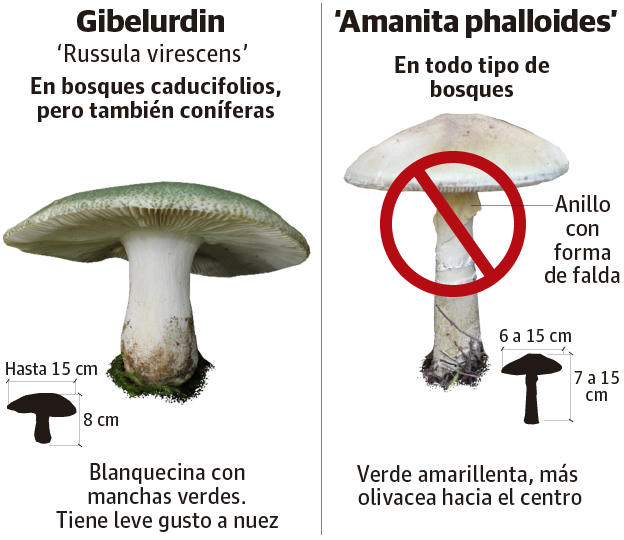 Gibelurdin-Russula virescens (bueno) y Amanita phalloides (mala)