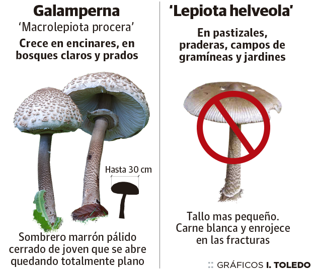 La Galamperna sabe muy bien: tiene un toque a fruto seco que la hace muy apreciada y es muy tiernita. ¿El problema? Que se asemeja mucho a la Lepiota helveola, que bajo su apariencia inofensiva produce intoxicaciones graves. Ambas son de tallo más o menos largo, tienen anillo y escamas... ¿en qué se diferencian entonces? Básicamente, en el tamaño. Las buenas, las galampernas, tienen un tallo más largo y un sombrero de unos 10 centímetros de diámetro.