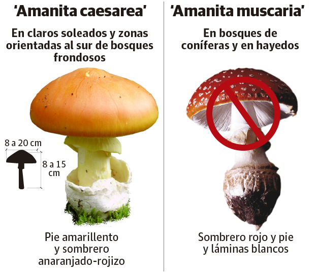 Amanita caesarea (buena) y Amanita muscaria (mala)