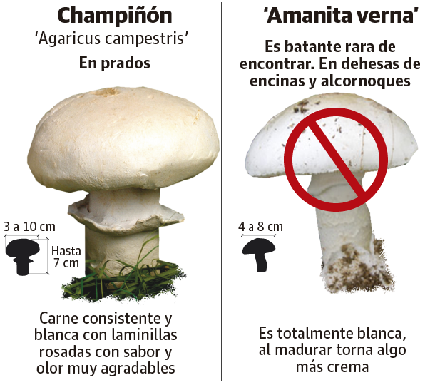 Los champiñones (Agaricus campestris) tienen una carne muy consistente y blanca y un olor y un sabor muy agradables... pero hay que tener cuidado con ellos si no se tiene experiencia como setero. Si usted mete a la cesta unos ejemplares blanquitos que parecen inocentes champiñones y resulta que se trata de ejemplares de Amanita verna, el error puede ser fatal, porque esta última es una de las setas más venenosas. Cuando el ejemplar es grande y está bien desarrollado, es fácil de identificar, pero a veces nos podemos encontrar con algunos pequeños y entonces el parecido con los champiñones es muy grande. ¿Cómo diferenciarlas si no somos muy expertos? Por su hábitat. La Amanita verna suele aparecer entre encinas, mientras que los champiñones son más habituales en prados y en algunos pinares. El problema es que a veces estos dos enclaves están muy cerca el uno del otro.