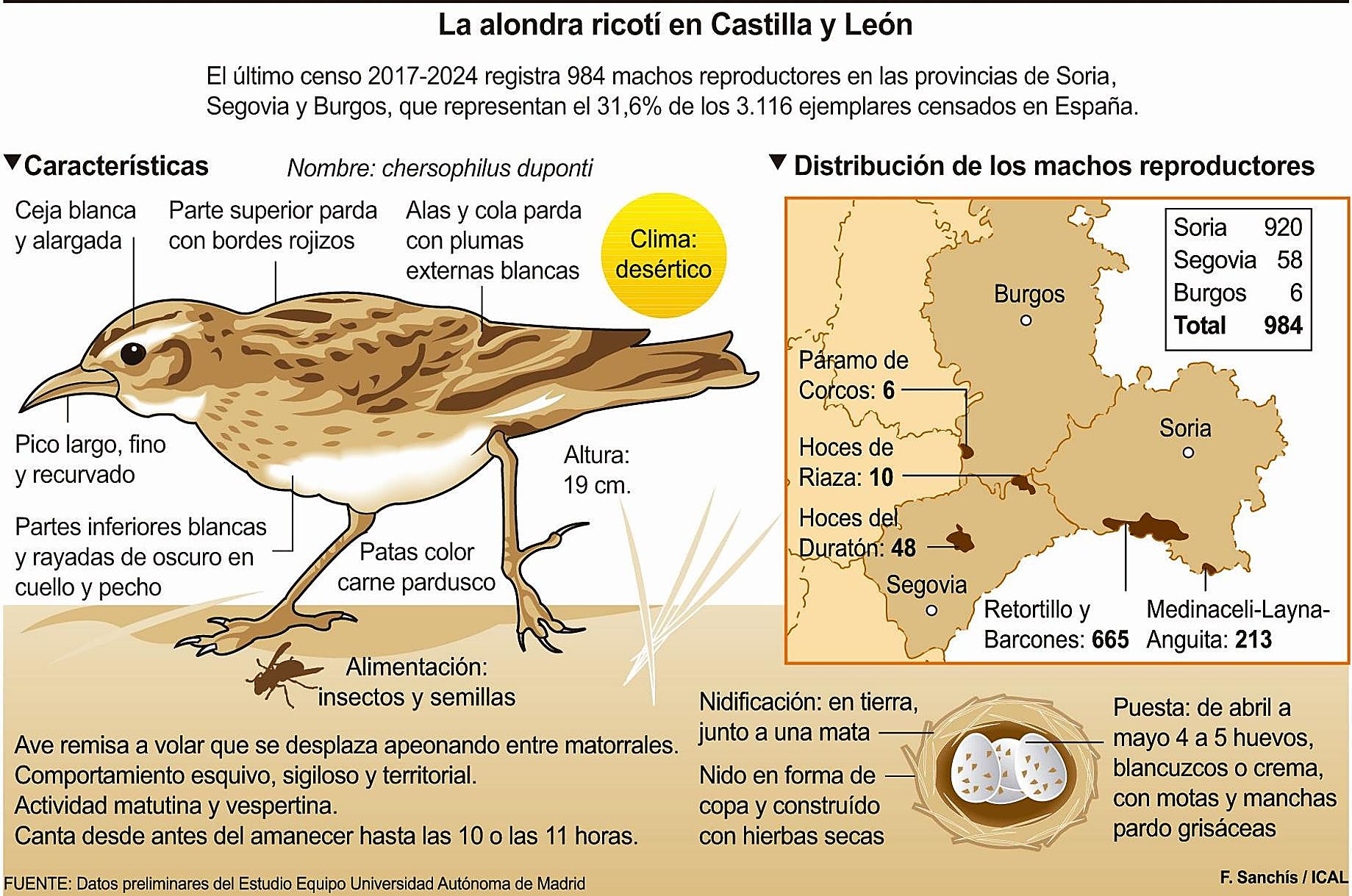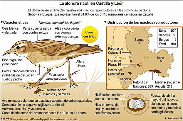 Un plumaje ocre, un tamaño pequeño y el particular y fácilmente reconocible canto, al que debe su nombre, no han evitado la alerta que se ciñe sobre la alondra ricotí, una especie sobre la que un nuevo estudio, en este caso de SEO/BirdLife, alerta del camino que se abre en España hacia la extinción. No es el caso, sin embargo, de Castilla y León, autonomía que alberga 984 ejemplares, según el último censo, un 12,2 por ciento más que en el periodo 2004-2007.