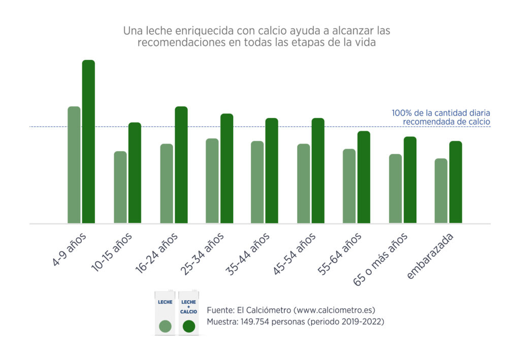 La situación cambia cuando la leche consumida es enriquecida con calcio, pues de este modo sí se alcanzan las recomendaciones. Excepto en el caso de las mujeres embarazadas, que se quedaban en el 90 %, y las mujeres mayores de 65 años, quienes se quedaban en el 91 %.