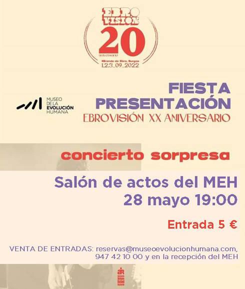 El Museo de la Evolución Humana quiere homenajear al festival 'Ebrovisión' con un concierto sorpresa este sábado, 28 de mayo, a las 19:00 horas, en su salón de actos. La entrada para asistir al homenaje cuesta cinco euros y se puede adquirir en el mostrador de recepción del museo, escribiendo a reservas@museoevolucionhumana.com o llamando al 947421000.