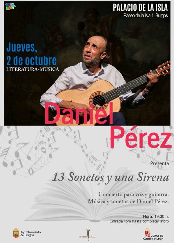 El Instituto Castellano y Leonés de la Lengua organiza en el Palacio de la Isla de Burgos el jueves, 2 de octubre, a las 19:30 horas, el recital poético '13 sonetos y una sirena', un concierto para voz y guitarra con música y letra del compositor y dramaturgo zamorano Daniel Pérez.