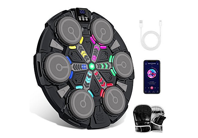 Con nueve velocidades ajustables y seis puntos de ataque RGB, esta máquina de boxeo musical de pared integra pantalla digital inteligente para monitorizar el rendimiento y altavoces Bluetooth que sincronizan luces y música. Su diseño compacto permite instalación sin taladros, mientras que los guantes incluidos y los materiales resistentes aportan seguridad y durabilidad en cada entrenamiento.