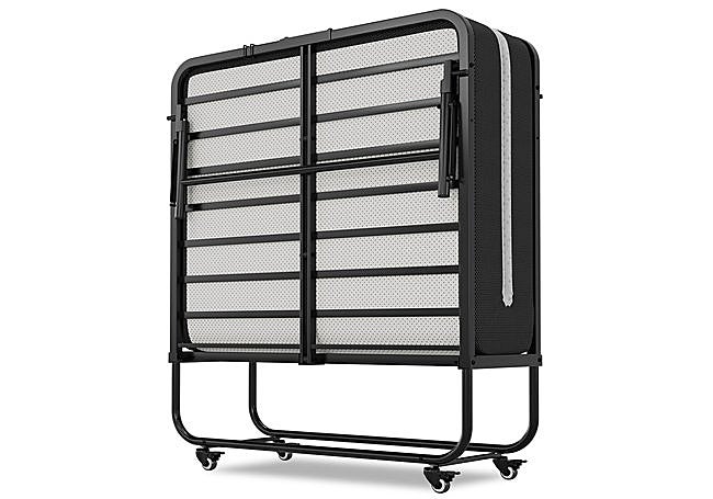 La estructura de acero gris antracita, robusta pero ligera, facilita el desplazamiento gracias a sus ruedas integradas. Al guardarse, apenas ocupa espacio y la funda antipolvo incluida protege la cama hasta el próximo uso. Ideal para quienes valoran la practicidad sin renunciar al confort, especialmente en apartamentos urbanos o habitaciones de invitados.