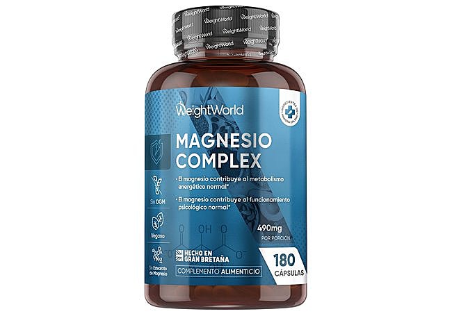 Más que una combinación, Magnesio Complex de WeightWorld reúne bisglicinato, citrato, malato y taurato de magnesio en cápsulas veganas, sumando 400 mg de magnesio elemental por dosis. Su fórmula sin gluten ni OGM incorpora L-Leucina y ofrece suministro para tres meses. El magnesio es un mineral relacionado con funciones como la salud muscular, la energía y el bienestar general.