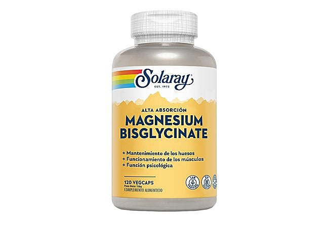 Presentado en cápsulas vegetales, Solaray Magnesio Bisglycinato incorpora una fórmula de alta absorción con 262,5 mg de magnesio bisglicinato por dosis. Incluye BioPerine® para potenciar la asimilación y está libre de gluten, siendo apto para veganos. El magnesio contribuye al funcionamiento normal de los músculos y puede ayudar a reducir la sensación de fatiga.