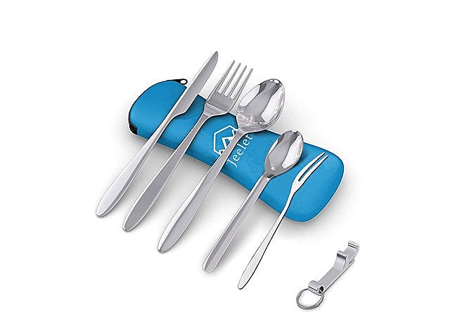Con seis piezas esenciales en acero inoxidable y un estuche compacto en color azul cielo, el set de cubiertos Vicloon ofrece una solución práctica para quienes comen fuera de casa. Incluye dos cucharas, tenedor, cuchillo, abridor de botellas y bolsa de transporte, todo pensado para facilitar la organización y el transporte diario.