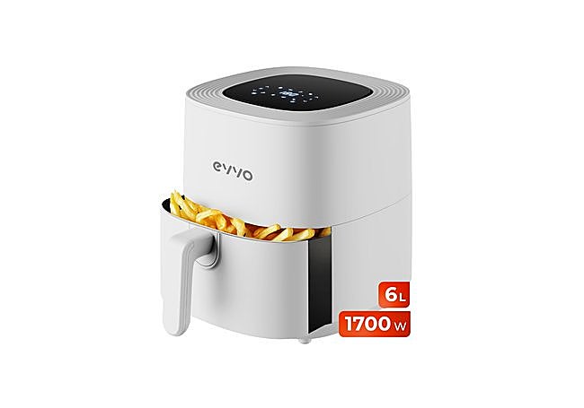 La freidora de aire EVVO de 6 L utiliza tecnología Dual Cyclone para distribuir el aire caliente de manera uniforme, garantizando una cocción rápida y saludable. Cuenta con ocho programas multifunción, un recipiente antiadherente para una limpieza sencilla, apagado automático para mayor seguridad y potencia de 1700 W, lo que permite cocinar con comodidad.