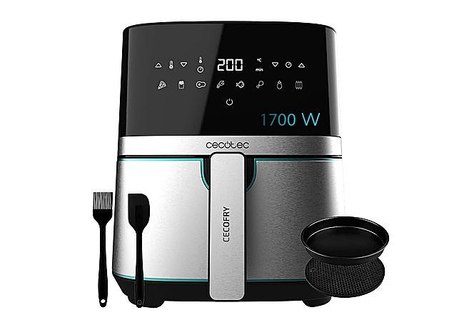 La freidora de aire digital Cecotec Cecofry Full Inox 5500 Pro tiene un diseño en acero inoxidable, una capacidad de 5,5 litros y una potencia de 1700 W. Dispone de un panel táctil multifunción con 8 modos preconfigurados y tecnología PerfectCook para la cocción. Incorpora accesorios de silicona y protección contra sobrecalentamiento.