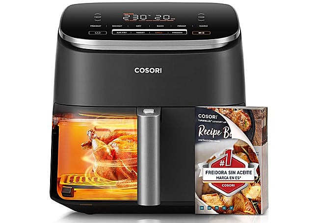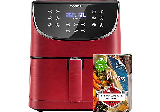 La Cosori Air Fryer de 5,5 litros cuenta con tecnología Rapid Air y un panel táctil con 13 modos automáticos. El interior es de acero inoxidable y tiene una potencia de 1700 W, con funciones que regulan el uso de aceite. Su diseño está pensado para facilitar la limpieza y el control de temperatura.