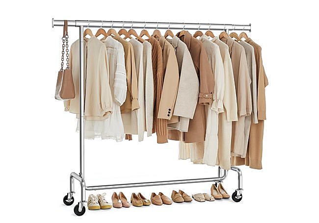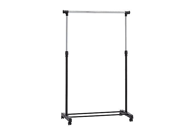 El perchero ajustable de Amazon Basics presenta una estructura metálica cromada que ofrece durabilidad y un diseño moderno. Su diseño telescópico permite ajustar la altura según las necesidades del usuario. Incluye una barra para colgar prendas y ruedas que facilitan su desplazamiento entre habitaciones. Este colgador portátil es una opción funcional para optimizar el espacio en el hogar.