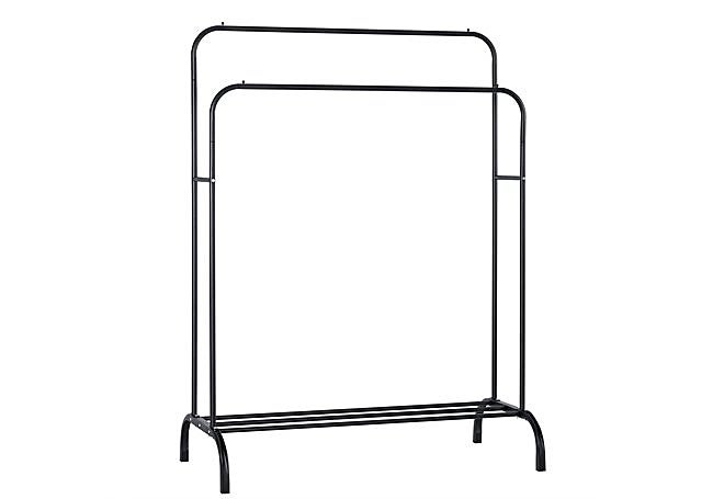Con estructura metálica robusta, este perchero burro doble destaca por sus dos barras horizontales y una base inferior reforzada para zapatos o cajas. El diseño compacto y minimalista se adapta a cualquier decoración, mientras que la capacidad de carga de hasta 30 kg por barra garantiza resistencia. Montaje sencillo y acabado resistente a la corrosión completan sus prestaciones.