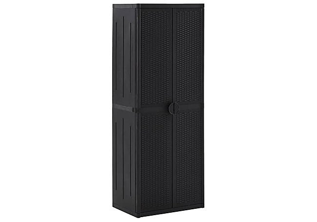 Con un acabado en ratán negro y estructura de polipropileno, este armario de almacenamiento exterior GuyAna ofrece una solución práctica para exteriores. Con dimensiones de 65 x 45 x 172 cm y cuatro baldas interiores, proporciona espacio suficiente para organizar productos de limpieza y herramientas.