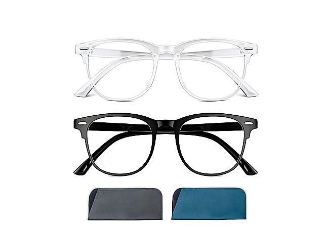 El set KEYRI incluye dos pares de gafas con filtro de luz azul y montura ligera de policarbonato. Su diseño es redondo y moderno. Las lentes bloquean eficazmente la luz azul y el deslumbramiento, lo que las hace adecuadas para la exposición a pantallas digitales.