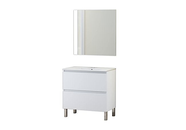 Con líneas contemporáneas y acabado blanco brillo, el mueble de baño Sabela de Abitti transforma el espacio con su presencia luminosa y elegante. Su formato de 80 cm integra dos cajones, dos puertas y un lavabo cerámico, facilitando el almacenaje en baños modernos o clásicos. La estructura de melamina resistente soporta la humedad y el uso diario, mientras que los tiradores y patas metálicas añaden un toque actual. El espejo a juego amplía la sensación de amplitud.