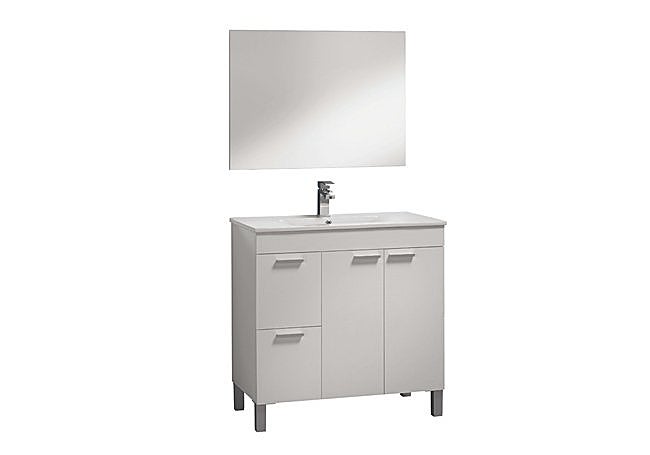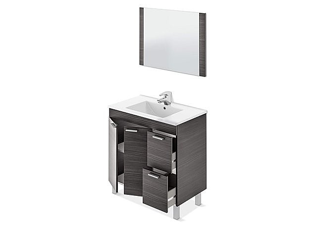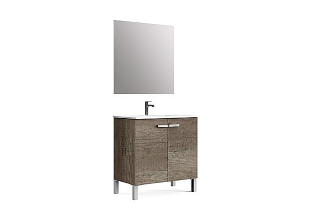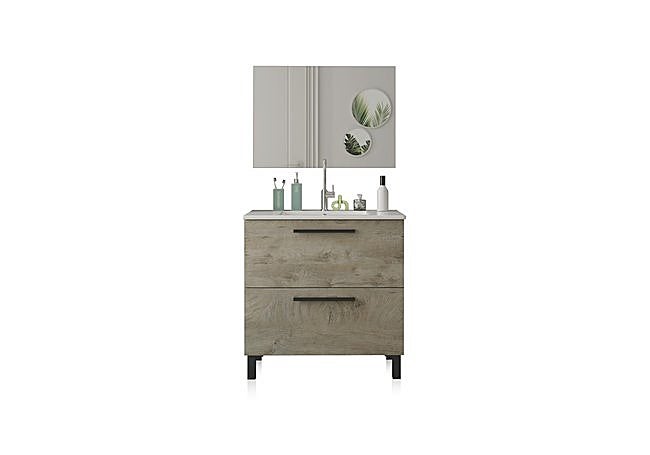 Con un acabado en gris ceniza y líneas depuradas, el mueble de baño Aktiva de ARKITMOBEL destaca por su formato compacto de 80 cm y su diseño contemporáneo. Dispone de dos puertas, dos cajones y un espejo a juego, ofreciendo una solución completa que se adapta a cualquier estilo de baño moderno.