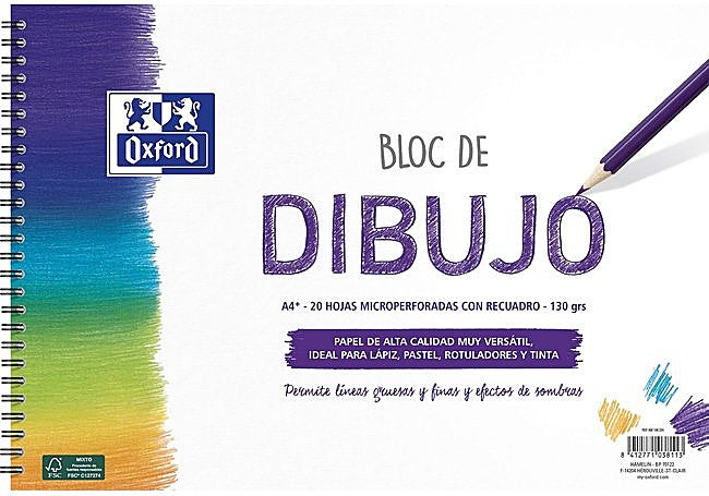 Con papel artístico de 130 g y encuadernación en espiral, el bloc de dibujo Oxford A4 ofrece una base resistente y versátil para trabajos creativos en el aula. La superficie rugosa facilita trazos gruesos y líneas finas, permitiendo experimentar con lápiz, rotuladores, tinta o pastel sin que el papel se deteriore.