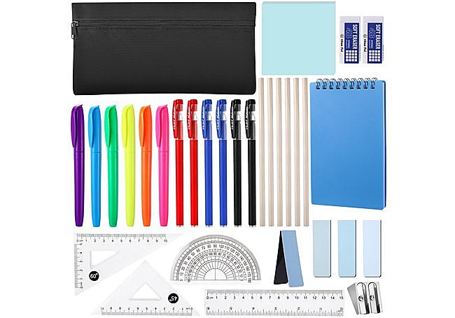 Con una selección de 29 piezas, este set de papelería Candcamp reúne en un estuche transparente todo lo necesario para el día a día escolar. El lote incluye bolígrafos de gel, resaltadores, lápices, notas adhesivas y reglas, junto a un bloc y gomas de borrar, facilitando la organización y el acceso rápido a cada herramienta.
