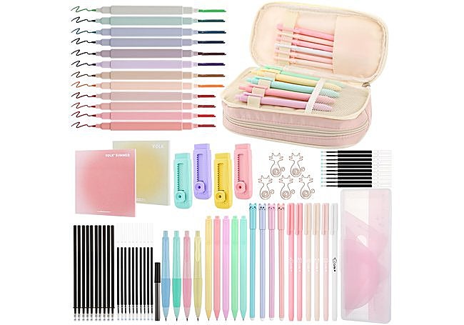 Con una selección de 78 piezas, el set de papelería Candcamp reúne bolígrafos de gel, resaltadores, lápices y accesorios en un estuche rosa compacto y resistente. La variedad de colores y formatos permite cubrir tareas de escritura, dibujo o subrayado sin dificultad, manteniendo siempre el escritorio en orden.