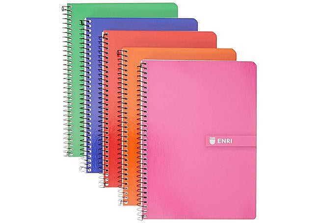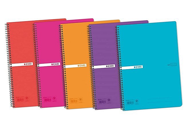 Con tapas de plástico translúcido y espiral negra, estos cuadernos Enri en formato folio A4 ofrecen una solución resistente y ligera para el día a día escolar. El pack incluye cinco unidades, cada una con 80 hojas de cuadrícula 4x4 y colores de tapa aleatorios que aportan un toque distintivo a cada materia.